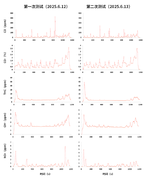 以下圖4-5和表1顯示了Gasboard-9802(CVS)系統(tǒng)用于某輕型車(chē)歐六排放試驗(yàn)室的現(xiàn)場(chǎng)照片、測(cè)試數(shù)據(jù)和測(cè)試結(jié)果。同一輛輕型車(chē)的兩次歐六WLTP排放測(cè)試比對(duì)分析結(jié)果顯示:實(shí)時(shí)數(shù)據(jù)曲線基本相似;THC、NMHC、CO、NO?和CO?排放因子變異系數(shù)分別為5.36%、3.37%、4.93%、10.61%和2.57%,重復(fù)性處于較好的水平。