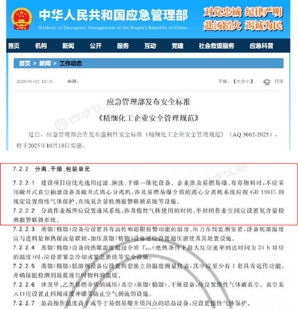 為有效防范精細(xì)化工領(lǐng)域頻發(fā)的安全事故,應(yīng)急管理部出臺(tái)強(qiáng)制性標(biāo)準(zhǔn)《精細(xì)化工企業(yè)安全管理規(guī)范》(AQ 3062-2025),將于2025年10月18日施行。新規(guī)要求,凡涉及易燃易爆介質(zhì)(如醇類、醚類、酮類、烷烴等)的離心分離系統(tǒng),必須配備惰性氣體保護(hù)并安裝在線氧含量檢測(cè)報(bào)警聯(lián)鎖系統(tǒng),確保氧氣濃度超標(biāo)時(shí),能自動(dòng)報(bào)警并采取相應(yīng)措施,如增加氮?dú)獬淙牖蛴|發(fā)緊急停機(jī)。