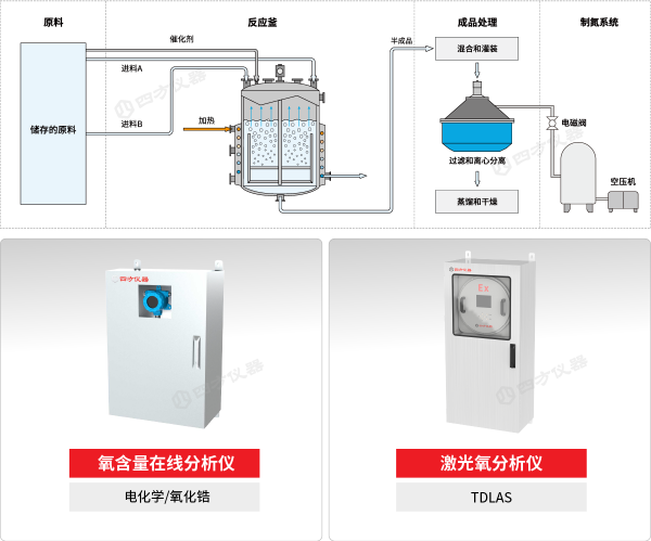 為解決以上監(jiān)測(cè)難點(diǎn),四方儀器專為精細(xì)化工特殊工況開(kāi)發(fā)的氧含量分析系統(tǒng),基于可調(diào)諧半導(dǎo)體激光(TDLAS)、電化學(xué)等多種氣體傳感技術(shù),結(jié)合高效前處理系統(tǒng),實(shí)時(shí)在線監(jiān)測(cè)反應(yīng)釜、離心機(jī)等設(shè)備腔體內(nèi)部的氧含量,并在超標(biāo)時(shí)自動(dòng)報(bào)警、啟動(dòng)聯(lián)鎖保護(hù)或惰化措施,有效防止爆炸發(fā)生。