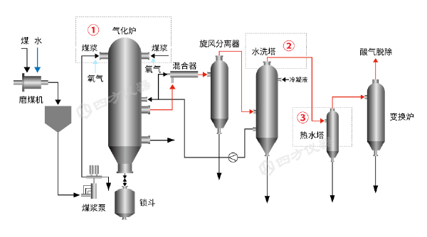 反應(yīng)后的高溫氣體進(jìn)入輻射鍋爐和對流鍋爐回收熱量,產(chǎn)生高壓蒸汽。隨后,合成氣進(jìn)入旋風(fēng)分離器以及水洗塔,通過分離與水噴淋的方式進(jìn)行初步除塵和降溫,去除大部分飛灰和熔渣顆粒,形成飽和水煤氣,為后續(xù)的變換或凈化工段做準(zhǔn)備。