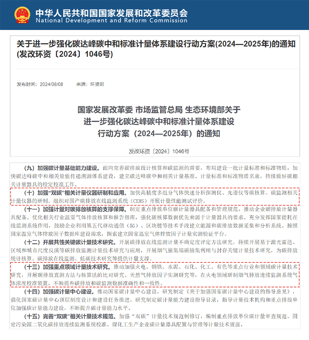 為提高我國(guó)碳計(jì)量?jī)x器裝備水平,國(guó)家發(fā)展改革委、市場(chǎng)監(jiān)管總局、生態(tài)環(huán)境部近日聯(lián)合印發(fā)《關(guān)于進(jìn)一步強(qiáng)化碳達(dá)峰碳中和標(biāo)準(zhǔn)計(jì)量體系建設(shè)行動(dòng)方案(2024—2025年)》(發(fā)改環(huán)資〔2024〕1046號(hào),以下簡(jiǎn)稱《方案》),《方案》提出,加快高精度多組分氣體快速分析探測(cè)儀、光譜儀等碳核算、碳監(jiān)測(cè)相關(guān)計(jì)量?jī)x器的研制;組織對(duì)國(guó)產(chǎn)碳排放在線監(jiān)測(cè)系統(tǒng)(CEMS)開展計(jì)量性能測(cè)試評(píng)價(jià);加強(qiáng)重點(diǎn)行業(yè)和領(lǐng)域碳計(jì)量技術(shù)研究,開展碳排放直測(cè)方法與核算法的比對(duì)研究等,不斷提升碳排放和碳監(jiān)測(cè)數(shù)據(jù)準(zhǔn)確性和一致性。