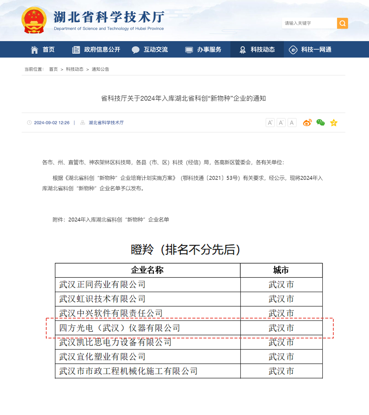 2024年9月2日,湖北省科技廳公布了2024年入庫湖北省科創(chuàng)“新物種”企業(yè)的名單,四方光電(武漢)儀器有限公司憑借其卓越的科技創(chuàng)新能力和迅猛的發(fā)展勢頭,成功入選。這一榮譽不僅是對四方儀器在科技創(chuàng)新領(lǐng)域深耕細(xì)作的肯定,也是對其在打造氣體分析科學(xué)儀器領(lǐng)域國際品牌階段性成果的認(rèn)可。