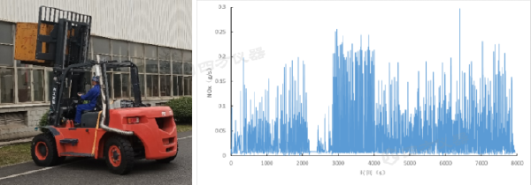 圖7 叉車實(shí)際工況排放測試現(xiàn)場與NOx質(zhì)量排放數(shù)據(jù)