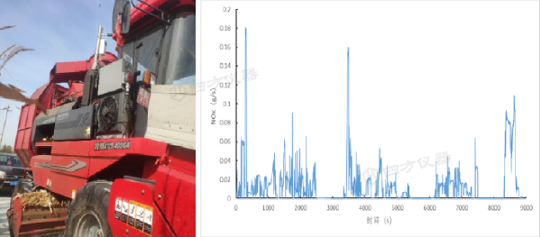 圖8 收獲機(jī)實(shí)際工況排放測試現(xiàn)場與NOx質(zhì)量排放數(shù)據(jù)