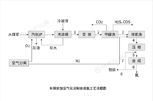 合成氨是在高溫高壓和催化劑存在下由氮和氫直接合成氨的過程,是一種基本無機(jī)化工流程,在現(xiàn)代化學(xué)工業(yè)中,氨是化肥工業(yè)和基本有機(jī)化工的主要原料,我國由于煤炭資源豐富、油氣資源相對貧乏,主要以煤生產(chǎn)氨,有研究數(shù)據(jù)表明,用煤、焦炭為原料的合成氨產(chǎn)量約占總產(chǎn)量的60%以上,其生產(chǎn)工藝的核心流程包括煤氣化制合成氣、變換、脫硫、脫碳、凈化、氨合成、分離等環(huán)節(jié),氣體分析在各階段的工藝控制、質(zhì)量監(jiān)測及安全運(yùn)行中都極為關(guān)鍵。