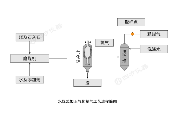原料煤經(jīng)稱重、磨制、篩分后制成煤漿,再經(jīng)低壓和高壓輸送,與氧氣混合霧化噴入氣化爐發(fā)生氣化反應(yīng),生成主要含 H2、CO2、CO、H2O及少量 CH4、H2S等的水煤氣。在線自動分析碳洗塔出口氣體成分,可以了解氣化爐的運(yùn)行情況,用于指導(dǎo)氣化爐及下游工序的操作,并估計(jì)氣化爐內(nèi)的溫度。