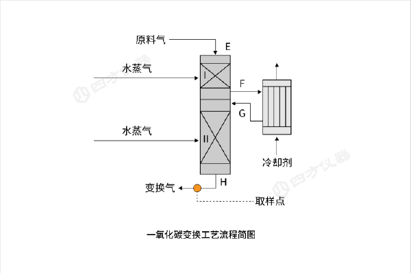 粗煤氣中高含量CO(44%~49%)一般通過高溫及低溫兩段變換反應(yīng)將其含量降至0.3%左右。在線自動分析變換爐出口氣體成分及熱值,可以計(jì)算變換爐入口水氣比,調(diào)節(jié)蒸汽注入流量,降低蒸汽消耗、延長催化劑使用壽命。