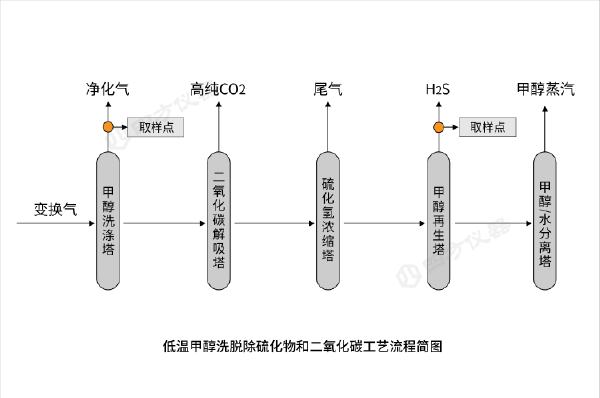 甲醇對CO2、H2S等酸性氣體有較大的溶解能力,而對H2、N2、CO等氣體的溶解度甚微,因此可從原料氣中選擇性吸收CO2、H2S。在實(shí)際應(yīng)用中,需要通過分析甲醇洗滌塔出口的CO2含量(測量范圍0~20ppm)來監(jiān)視脫碳效果,同時分析甲醇再生塔出口的H2S含量(測量范圍0~60%)。